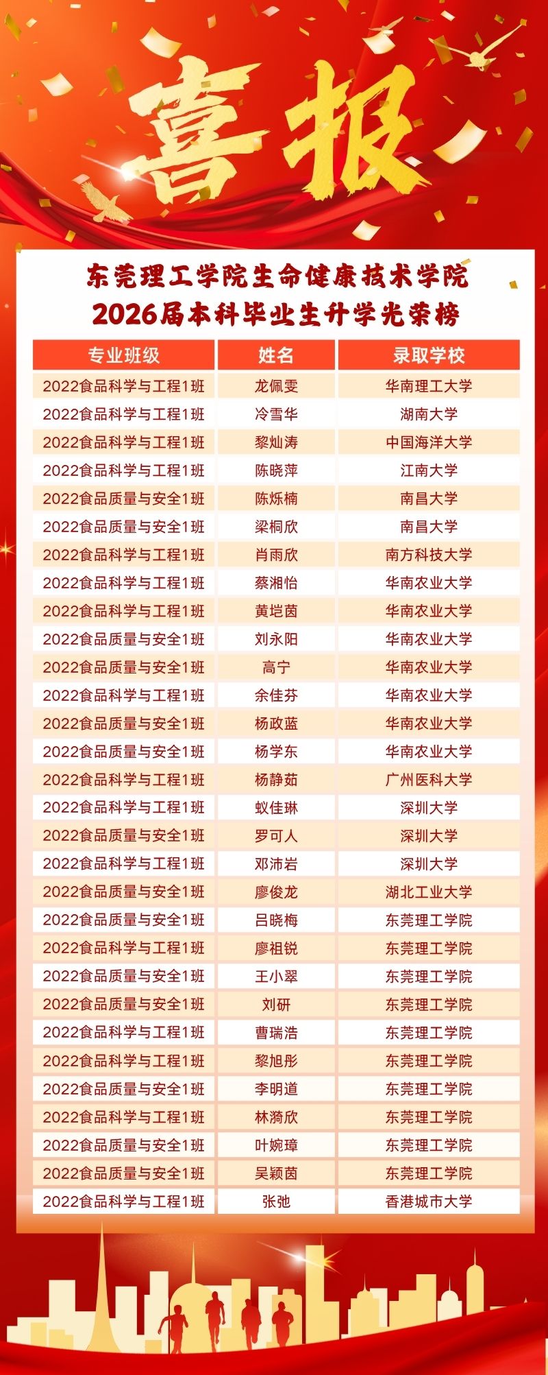 学子表现亮眼,斩获丰硕成果,实现历史性突破,30人成功录取硕士研究生,升学率达46.15%,较2024届23.44%实现翻倍增长,多名学子被华南理工大学、湖南大学、中国海洋大学等知名高校录取,充分彰显学院育人工作实效,也标志着学院人才培养质量实现跨越式发展。